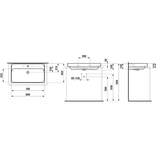Lavabo da appoggio LAUFEN Meda, lucido, 800x460 mm, 3 fori per rubinetto, senza sfioratore