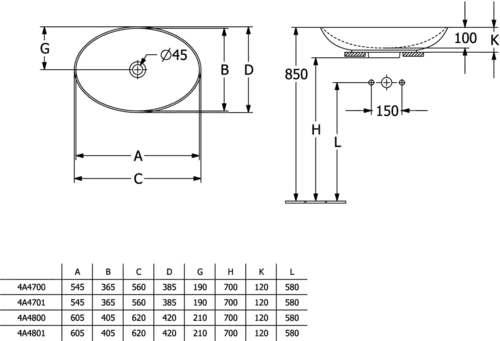 Lavabo da appoggio Villeroy & Boch Loop & Friends, Ovale, 620x420x120 mm, senza sfioratore, senza foro per rubinetto
