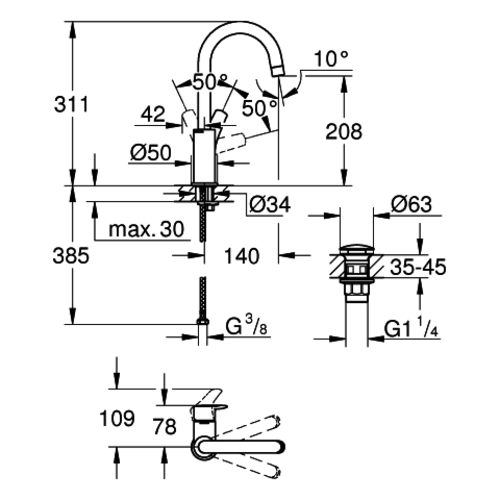 Miscelatore monocomando per lavabo Eurosmart di Grohe, dimensione L, sporgenza 140 mm, scarico push-open pop-up, orientabile