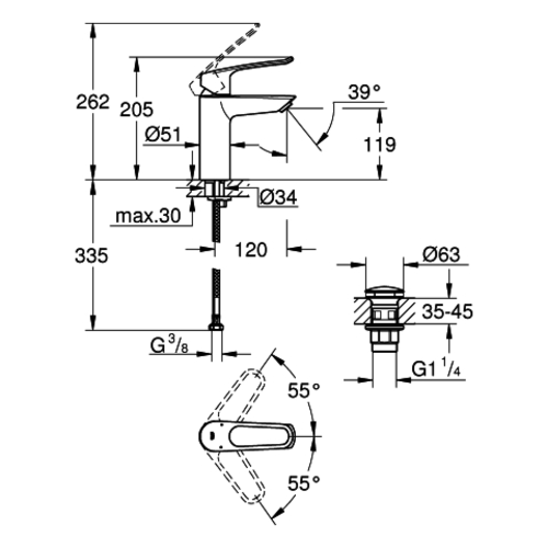 Miscelatore monocomando per lavabo Eurosmart di Grohe, dimensione M, sporgenza 120 mm, scarico push-open PUSH, maniglia a leva aperta