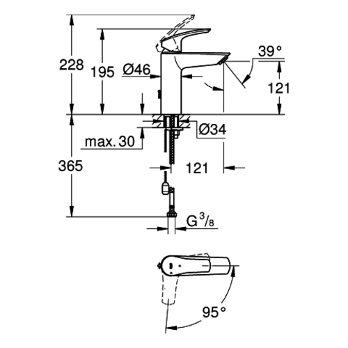 Miscelatore monocomando per lavabo Eurosmart di Grohe, dimensione M, sporgenza 121 mm, catenella a scomparsa, EcoMode