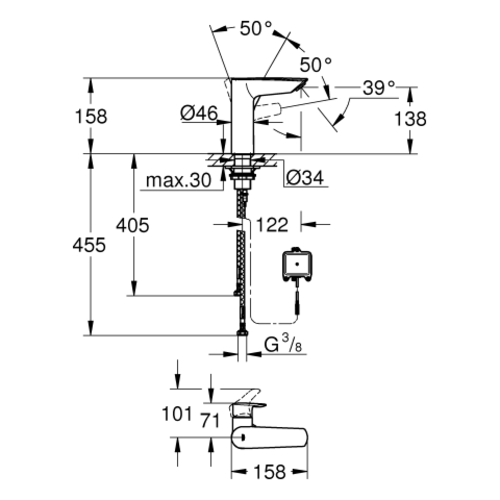 Miscelatore monocomando per lavabo Eurosmart di Grohe, dimensione M, sporgenza 122 mm, scarico push-open pop-up, attivazione touch-free, funzionamento a batteria