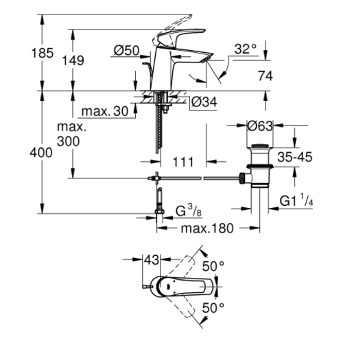 Miscelatore monocomando per lavabo Eurosmart di Grohe, misura S, sporgenza 111 mm, set di scarico