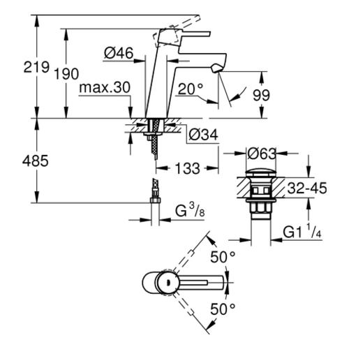 Miscelatore monocomando per lavabo Grohe Concetto, dimensione M, sporgenza 133 mm, scarico push-open PUSH, cromato