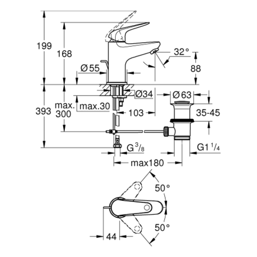 Miscelatore monocomando per lavabo Grohe Euroeco, dimensione S, sporgenza 103 mm, scarico in metallo