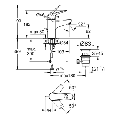 Miscelatore monocomando per lavabo Grohe Euroeco, dimensione S, sporgenza 103 mm, scarico in plastica