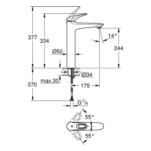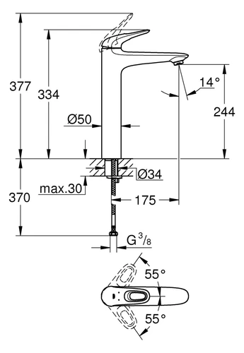 Miscelatore monocomando per lavabo Grohe Eurostyle, dimensione XL, sporgenza 175 mm, senza scarico, maniglia a leva aperta