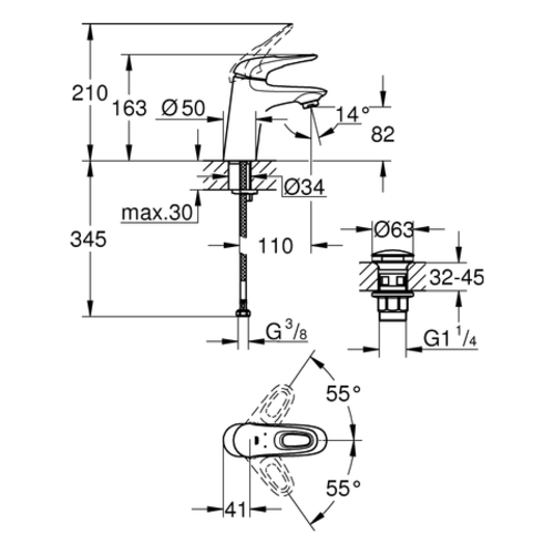 Miscelatore monocomando per lavabo Grohe Eurostyle, misura S, sporgenza 110 mm, scarico push-open PUSH, maniglia a leva aperta