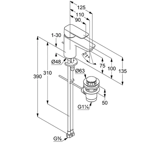 Miscelatore monocomando per lavabo KLUDI PURE, installazione monoforo, altezza bocca 75 mm, con set di scarico, cromato