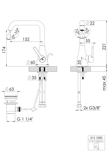 Miscelatore monocomando per lavabo Steinberg Serie 315, con set di scarico, sporgenza 152 mm, altezza 221 mm