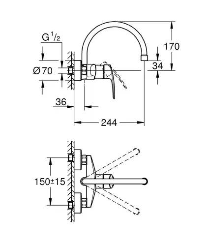 Miscelatore monocomando per lavello Grohe Eurosmart, sporgenza 244 mm, montaggio a parete, orientabile