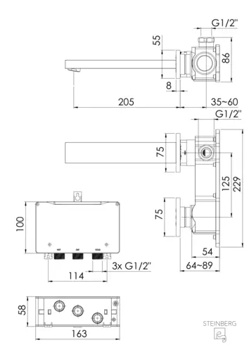 Miscelatore per lavabo a parete Steinberg Serie 160, controllo completamente elettronico del volume e della temperatura, sporgenza 205 mm