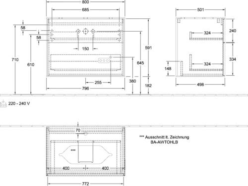 Mobile sottolavabo Villeroy & Boch, 2 cassetti, con illuminazione, centro lavabo, con foro per rubinetto, 800x603x501 mm, Glass Matt White
