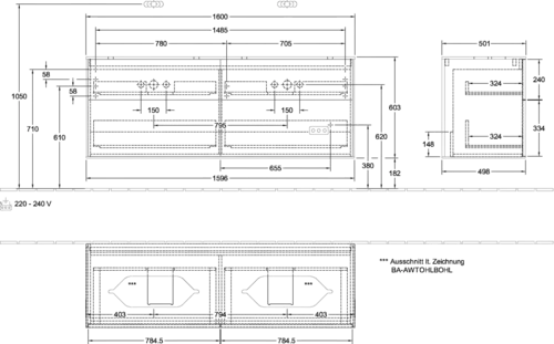 Mobile sottolavabo Villeroy & Boch, 4 cassetti, con illuminazione, per 2 lavabi, senza foro per rubinetto, 1600x603x501 mm, Glass Matt White