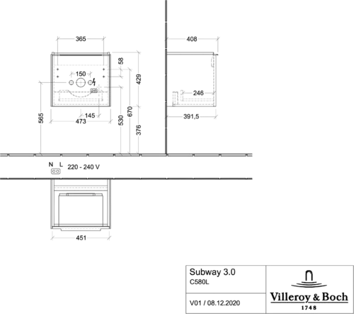 Villeroy & Boch Subway 3.0 Mobiletto, illuminazione LED, 1 cassetto, 473x429x408 mm
