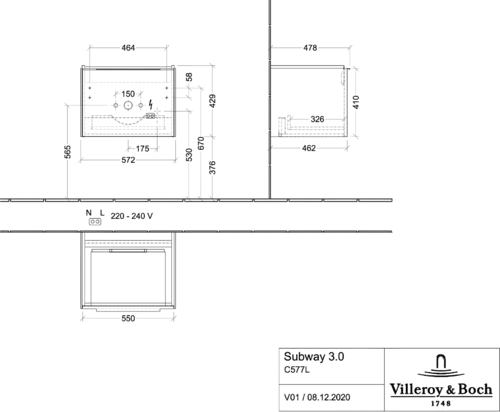 Villeroy & Boch Subway 3.0 Mobiletto, illuminazione LED, 1 cassetto, 572x429x478mm