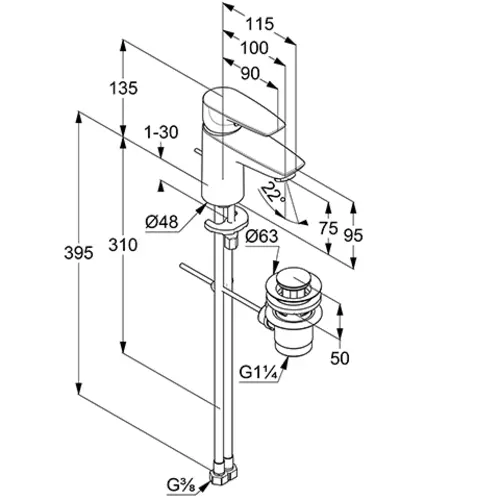 - Uitloophoogte onderkant 75 mm
