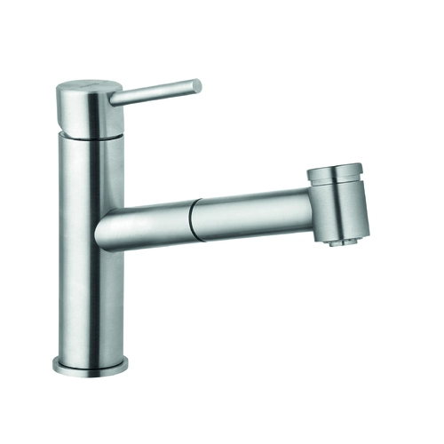 KLUDI STEEL Mezclador monomando de fregadero, cerrado, con rociador de vajilla, Eco, acero inoxidable cepillado