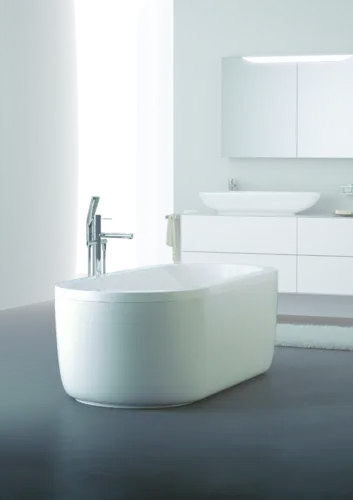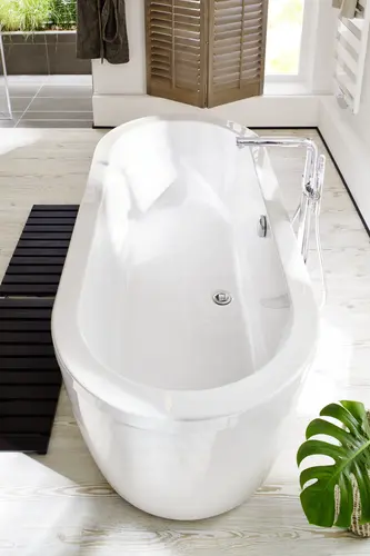 Koralle T200 freistehende Badewanne Oval mit angeformter Schürze, 1800x800mm, Überlauf vorne, mit Integriertem Fußgestell, weiss