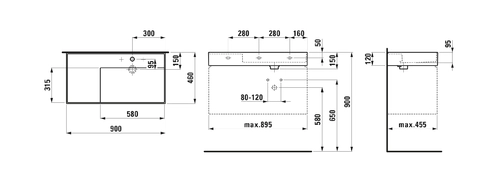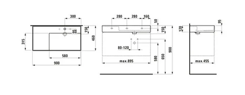 LAUFEN Kartell Waschtisch, unterbaufähig, Ablage links, 3 Hahnlöcher, ohne Überlauf, 900x460mm