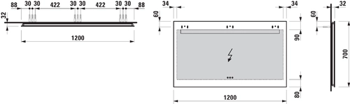 LAUFEN Leelo Spiegel mit integrierter horizontaler LED-Beleuchtung, Aluminiumrahmen, 1200 mm, Version mit 3 Touch Sensorschaltern