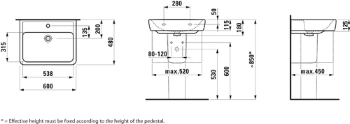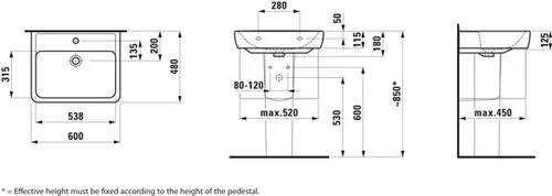 LAUFEN PRO A Waschtisch, 1 Hahnloch, mit Überlauf, 600x480mm