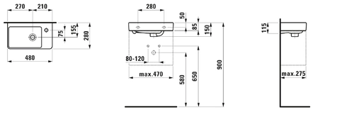LAUFEN PRO S Handwaschbecken, Becken links, 1 Hahnloch rechts, ohne Überlauf, 480x280mm