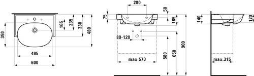LAUFEN The New Classic Waschtisch, unterbaufähig, ohne Überlauf, 3 Hahnlöcher, 600x480mm
