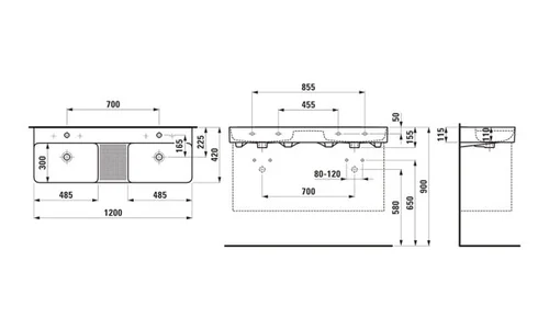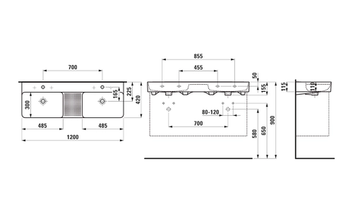LAUFEN VAL Doppelwaschtisch, ohne Hahnloch, mit Überlauf, 1200x420mm, semi-trockener Bereich mittig