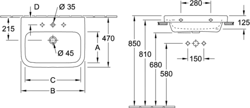 Villeroy & Boch Architectura wastafels, rechthoekig, 1 kraangat, met overloop, gepolijste onderkant, 600x470mm