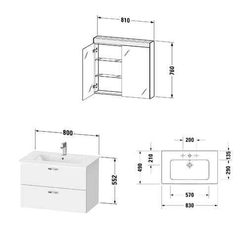 Duravit Xbase, wandmeubelset, met LED-spiegel, wastafel en badmeubel, breedte 800 mm