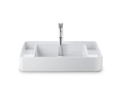 - Met keramisch kraandeksel in wastafelkleur: wastafel en kraan vormen optisch een perfecte eenheid