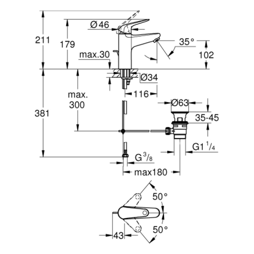Grohe Euroeco eengreeps wastafelmengkraan, M-maat, 116 mm uitloop, kunststof Baduitloop