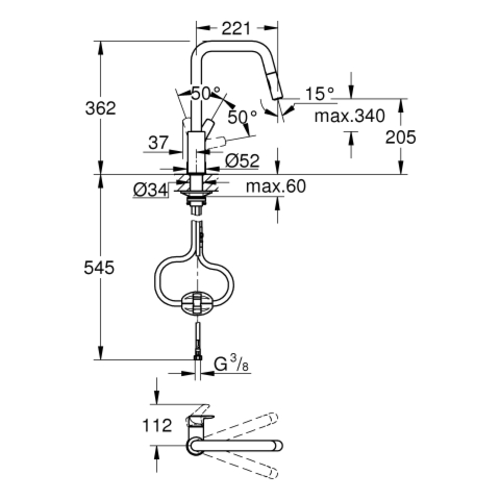 Grohe Eurosmart eengreeps wastafelmengkraan, 221mm projectie, draaibaar, uittrekbare dubbele handdouche