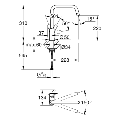 Grohe Eurosmart eengreeps wastafelmengkraan, 228 mm uitval, hoog, draaibaar