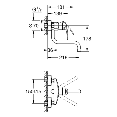 Grohe Eurosmart eengreeps wastafelmengkraan, wandmontage, 216 mm projectie