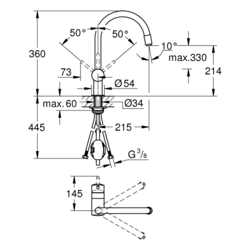 - zwenkbereik 90°: beperkt zwenkbereik van de uitloop om overstroming te voorkomen