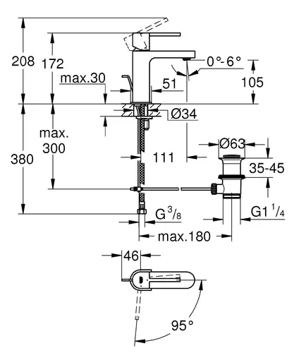 Grohe Plus ééngreeps wastafelmengkraan, S-maat, 111 mm projectie, Baduitloop, EcoMode