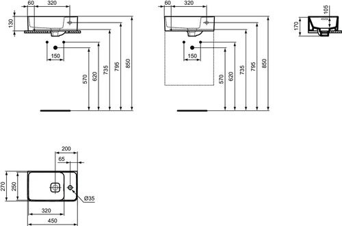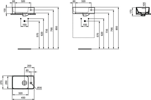 Ideal Standard Strada II fonteintje 450mm, 1 kraangat rechts, met overloop