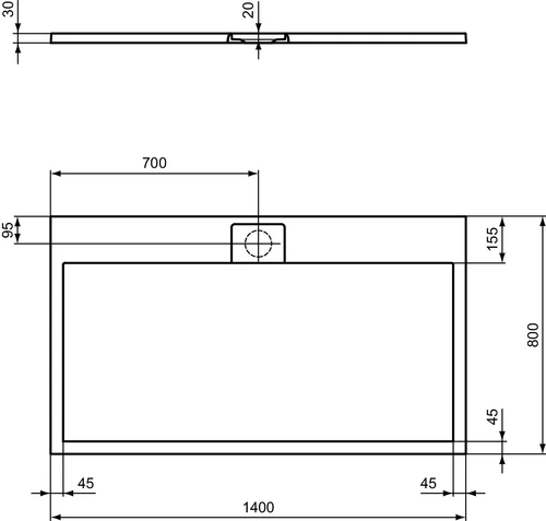 - Buitenafmetingen (BxDxH): 1400x800x30 mm