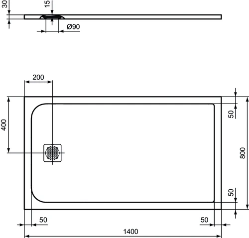 Ideal Standard Ultra Flat S rechthoekige douchebak 1400x800x30mm, afvoer aan korte zijde