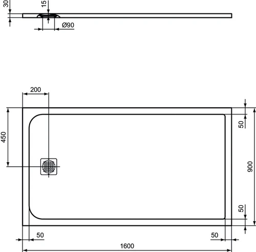 Ideal Standard Ultra Flat S rechthoekige douchebak 1600x900x30mm, afvoer via korte zijde