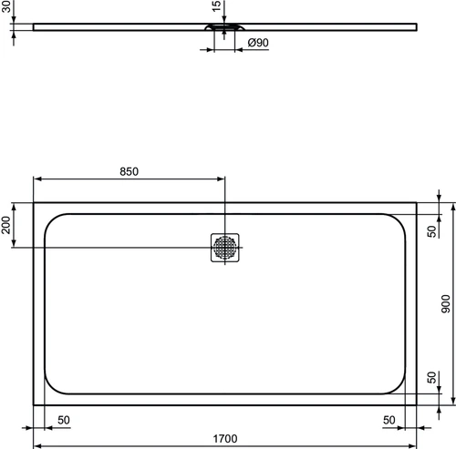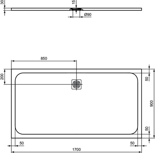Ideal Standard Ultra Flat S rechthoekige douchebak 1700x900x30mm, afvoer aan lange zijde