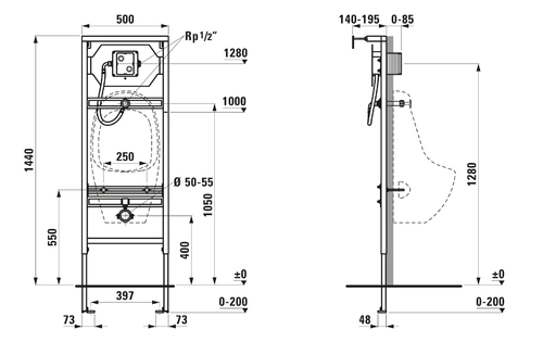 LAUFEN CU1 installatiesysteem voor urinoirs, zonder geïntegreerde bediening, in hoogte verstelbare voet