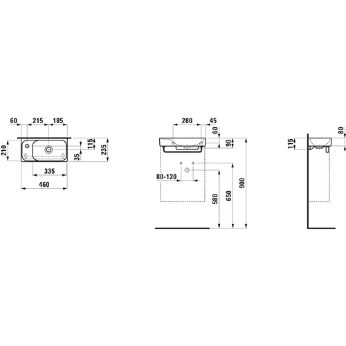 LAUFEN MEDA fonteintje, onderbouw, kraangat bankje links, 460x235mm, zonder kraangat, zonder overloop