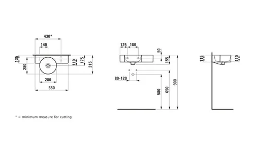 LAUFEN Val handdouche, zonder kraangat, planchet rechts, met overloop, inkortbaar, 550x315mm