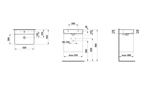 LAUFEN VAL wastafel, onderbouw, 3 kraangaten, zonder overloop, 550x420mm