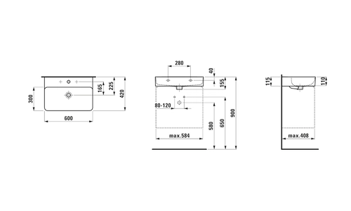 LAUFEN VAL wastafel, onderbouw, 3 kraangaten, zonder overloop, 600x420