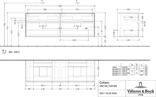 Villeroy & Boch Collaro wastafelmeubel, voor 2 wastafels, wandmontage, 1600x548x500mm