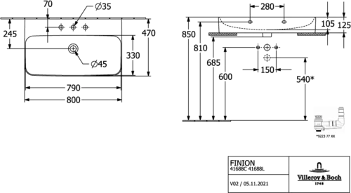 Villeroy & Boch Finion wastafels, verborgen overloop, 1 kraangat, gepolijste onderkant, 800x470mm